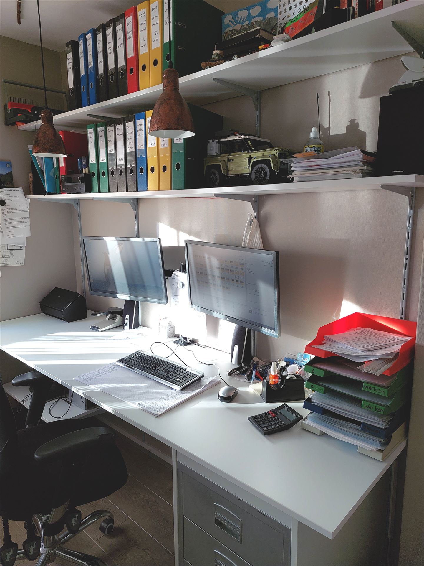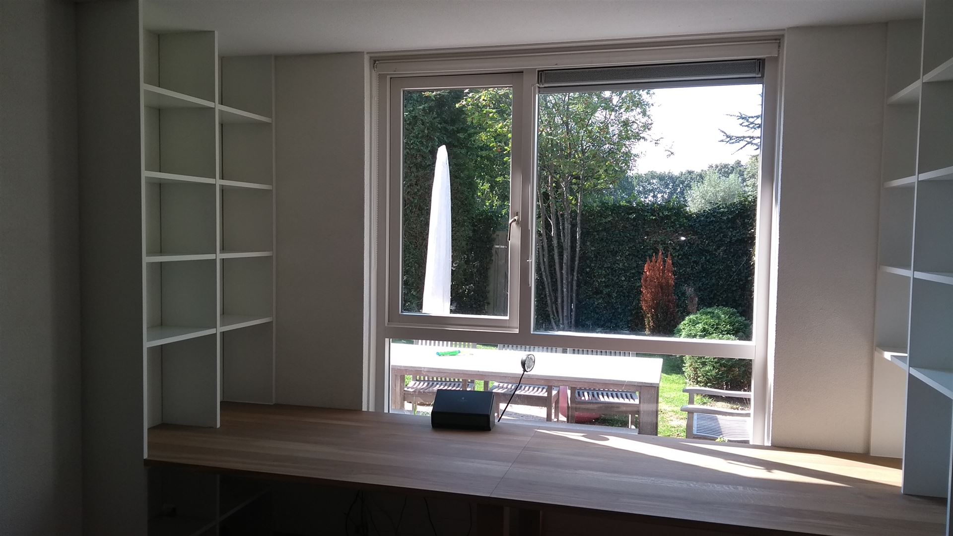 Een strak modern bureau, eenvoudig bureau met een blad en boekenplanken in wandrail of juist luxe landelijk romantisch bureau'tje of secretaire.